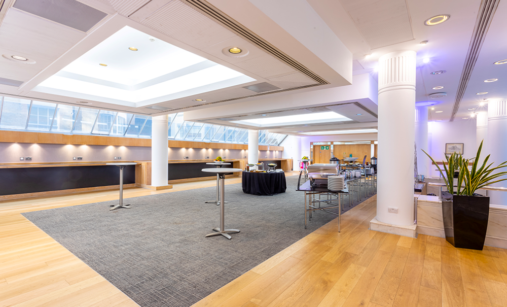 A stunning room flooded with natural daylight from the vaulted glass roof and surrounding walls. This offers an outside-inside feel when the weather can be temperamental and is a beautiful setting both during the day and at night. This versatile room is perfect for drinks receptions, conference dining and exhibitions.