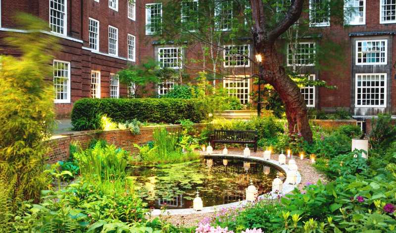 The building is centred on a courtyard with a memorial fountain. Furthermore, a private garden with a pond, housing physic plants with medicinal properties can be found to the rear of the building and provides a tranquil outdoor space for events. The garden is also famous for being the grounds to the house of Charles Dickens where he is said to have written some of his most famous novels.