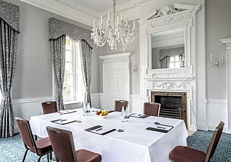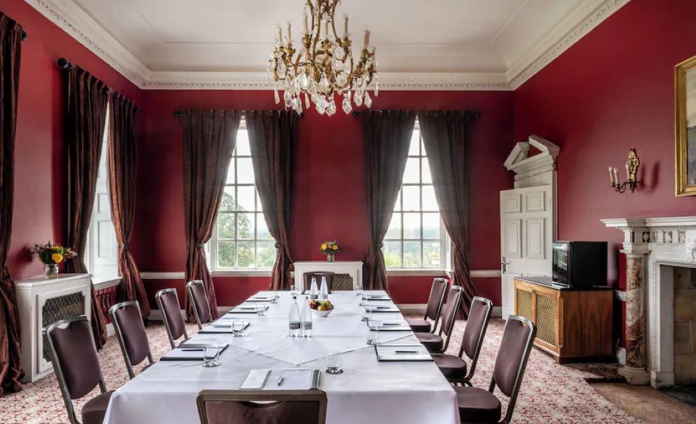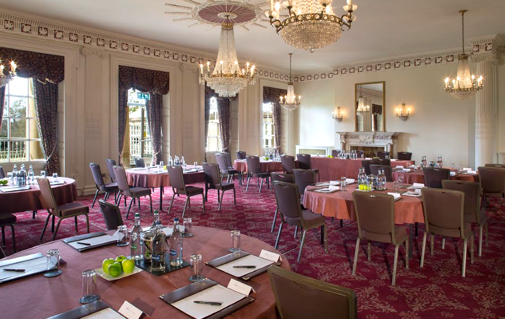 One of the original staterooms of the house, the Library is a spacious, bright airy meeting room, full of classical architectural features, flooded with natural light and views over the main lawn area.