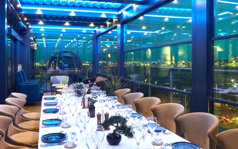 Sky Bar. Our spectacular and unique Sky Bar and restaurant is located on the sixth floor, serving Pan Asian Cuisine. The large outside terrace offers stunning views of the airport runway and London Skyline.