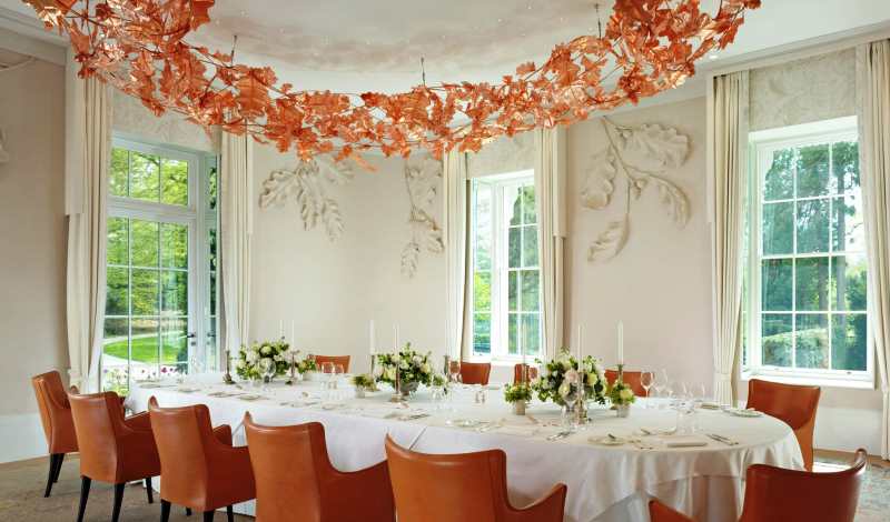 The Oak Room offers classical elegance with a modern twist and includes a private entrance and ante room. Dual aspect windows provide fresh natural daylight, and a hanging sculpture of copper oak leaves adds warmth and a striking touch.