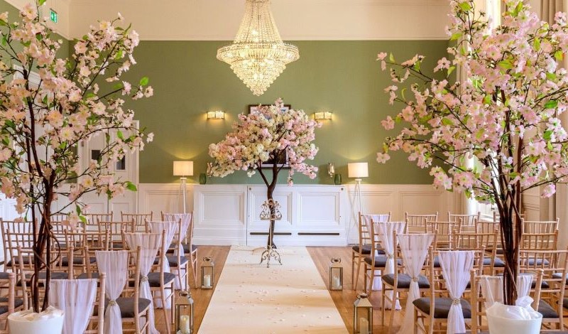 The Terrace Ceremony Room boasts a light and airy decor with traditional wooden floors, striking chandeliers and floor-to-ceiling windows overlooking the formal gardens. As the name suggests, this room offers access to the terrace.