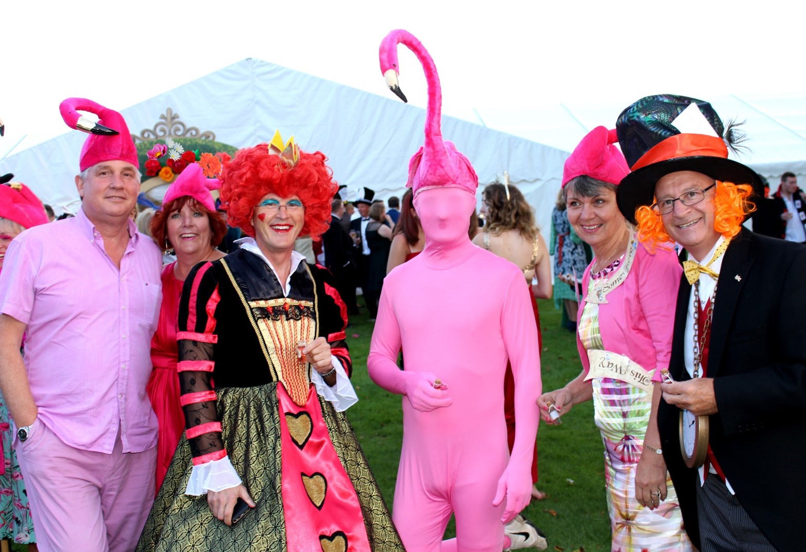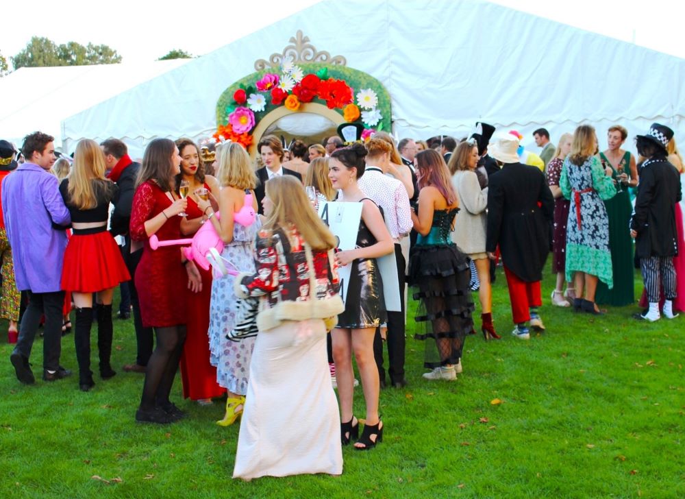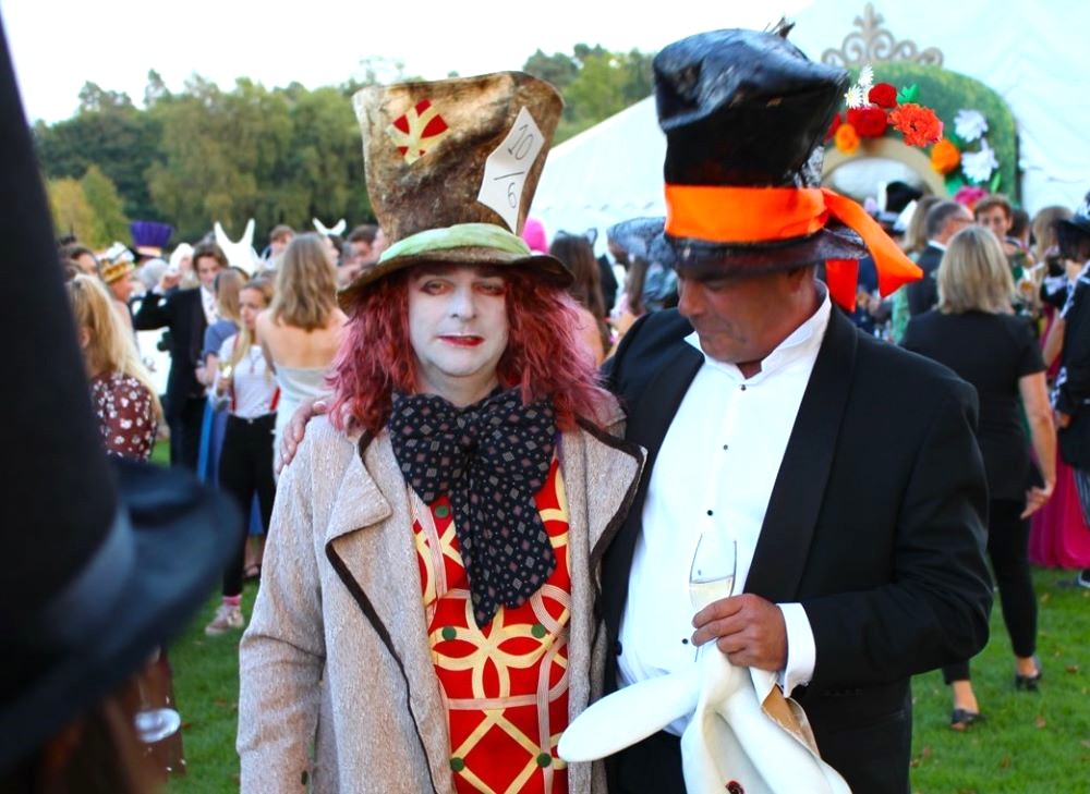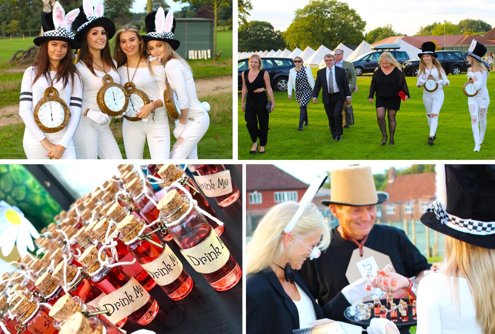We began in the car park; where guests were greeted by glamorous White Rabbits encouraging them up the daisy-chain lit pathway to the Wonderland Marquee.