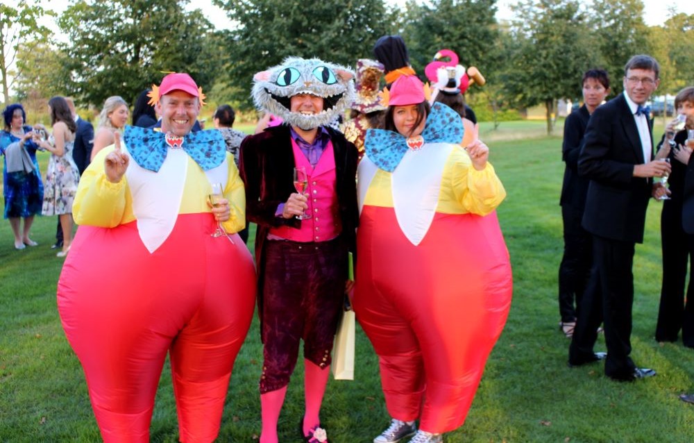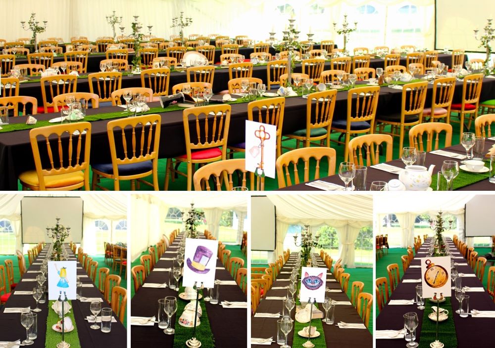 The Cheshire Cat Bar reception area had a host of red umbrellas decorated with white spots hanging from the ceiling like upside-down toadstools. Waiting staff, in Cheshire Cat make up, served bubbles and canapés from the LED lit bars while guests mingled among the This Way, That Way signs, giant clock etc…and peered through the looking glass at the seating plan.