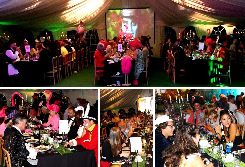 After the reception, we revealed The Mad Hatter’s Tea Party and guests were seated at long tables dressed in black linen adorned with mad paraphernalia—foliage, vintage books, clocks, tea pots etc.. with giant candelabra centrepieces and multi coloured chairs. The lighting was designed to give the impression of being under the forest canopy. Huge screens hung from the ceiling with images of the Mad Hatter and other Wonderland characters. The White Rabbit kept popping up at intervals around the room and the delicious 2 course meal was served by staff dressed as the Mad Hatter.