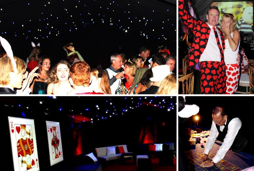As soon as dinner and speeches were over, the band begun and the Queen of Hearts casino opened. The atmosphere in the casino was dark and glamorous with black walls, chandeliers, black and white soft seating with jewelled cushions, roulette and black-jack tables. Giant playing cards adorned the walls and the croupiers wore Queen of Hearts crowns.