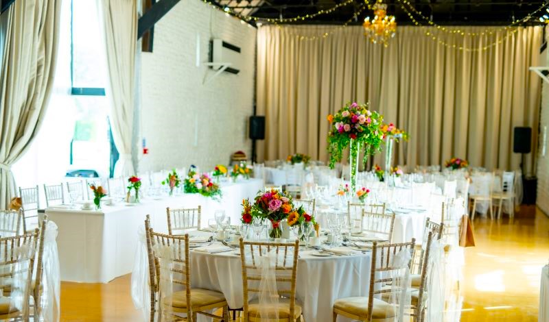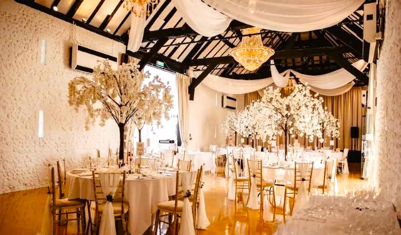 Both our barns feature exposed original oak beams, French crystal chandeliers and warm white fairy light canopies.