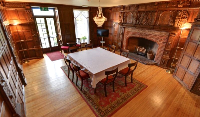 This beautiful room situated in the Manor House offers oak panelling, an open fireplace, floor to ceiling windows and doors out to the landscaped gardens.