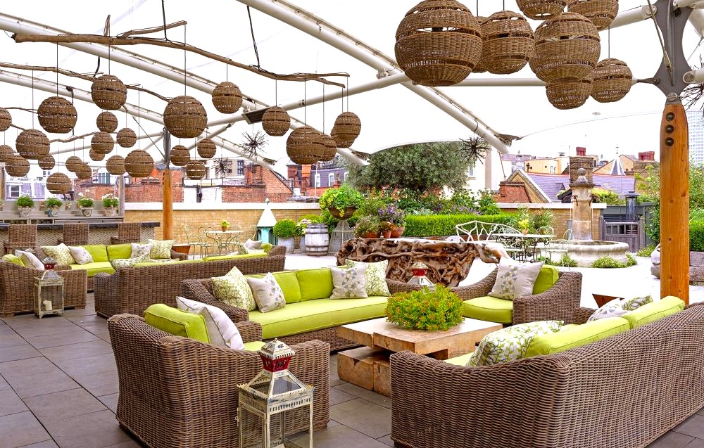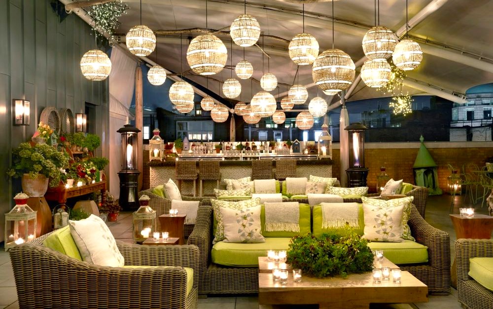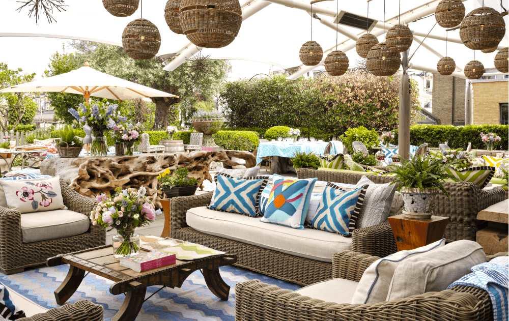 The Roof Terrace on the 4th floor is a large, leafy garden with sweeping views over the London skyline. Watched over by two ancient olive trees and surrounded by apple and pear fruit trees, the garden blooms all year round with seasonal flowers from poppies and lemon verbena to jasmine, creating a wild meadow.
