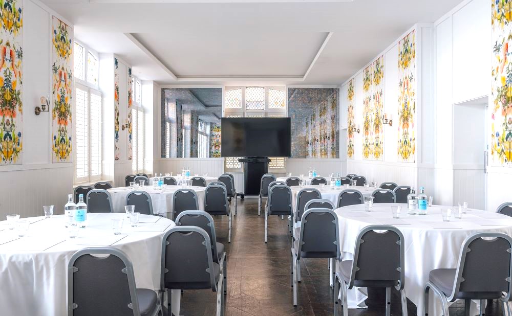 Our main event room, in simple white décor, comes with typical Regency features such as high ceilings and original stained-glass statement windows, its own private bar, and a panoramic backdrop of Brighton seafront. It may be divided into two smaller rooms. Ideal for conferences, receptions, weddings and large events.
