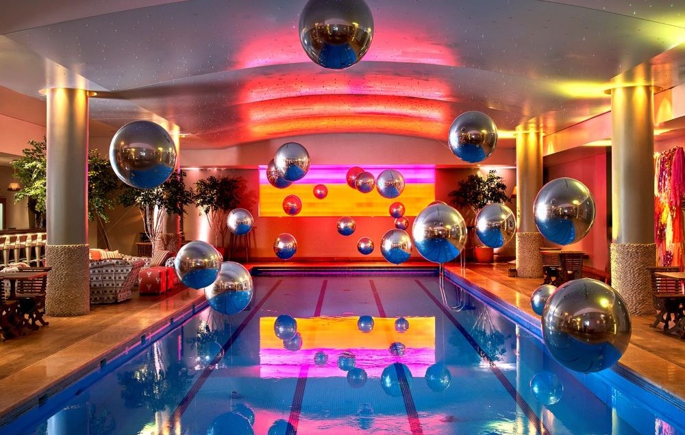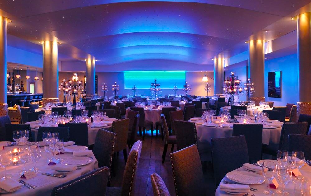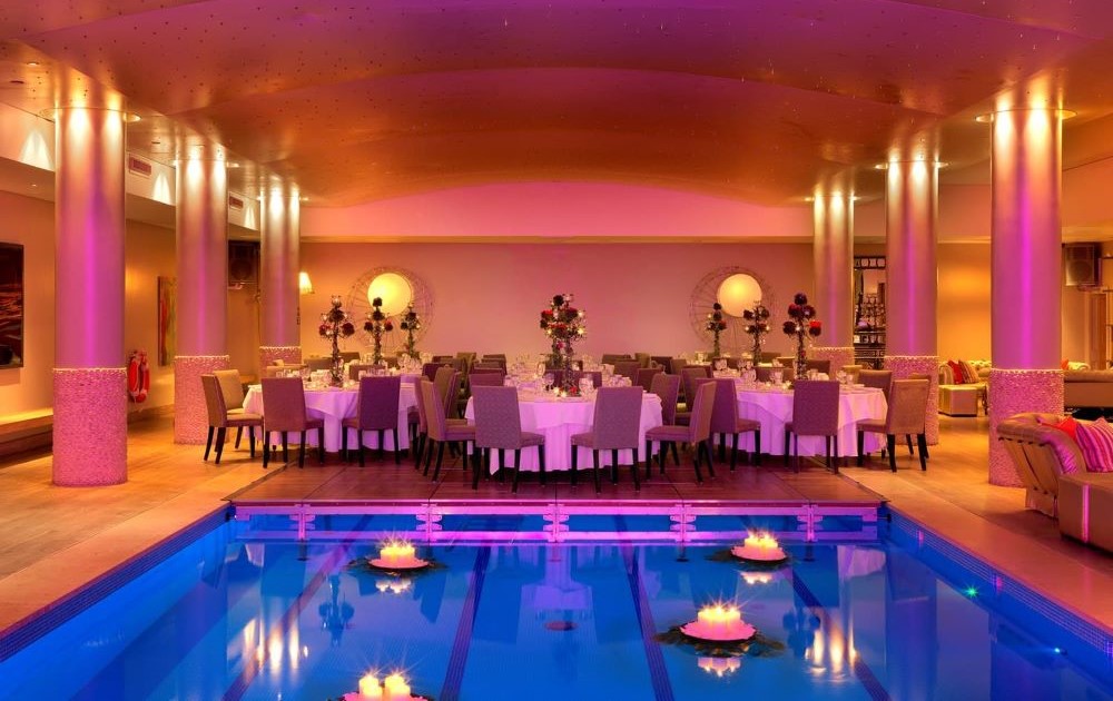 The Pool Area is a stunning space for a variety of events. A grand and modern space, with a sleek 55 foot swimming pool edged in stone. the Pool is surrounded by acres of grey oak and has a ceiling covered in hundreds of fibre-optic lights. There is a pewter bar and a spectacular lighting scheme that uses strong contrasts of light and shadow and an ever-changing colourful light installation by Martin Richman. The pool can be customised with beautiful floating candles or completely covered to create a fabulous dance floor or a large networking space.