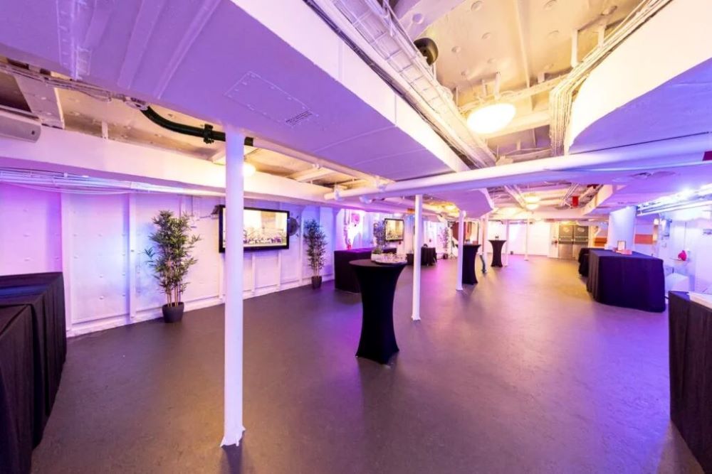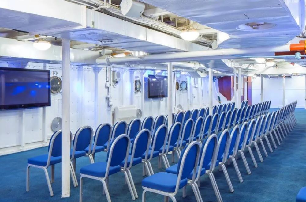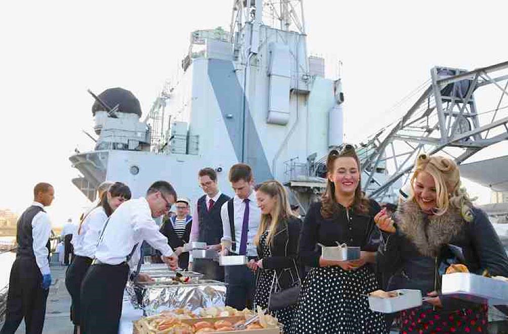 The Boat Deck, one of the largest decks for hire. Outdoors, but with a canopy and alternative indoor spaces to retreat to in poor weather, the Boat Deck used to be the holding area for the small boats, having previously been the spot from which Walrus aircraft were, literally, catapulted into the air.
