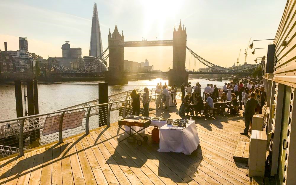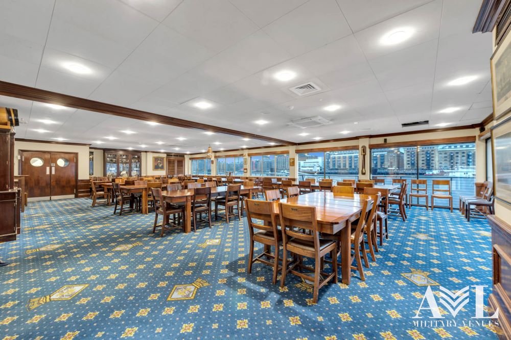 The Wardroom, with stunning views over the Thames to Butler’s Wharf and up to Tower Bridge can accommodate a variety of functions. With glass doors all around, you will have Tower Bridge as the backdrop to your event. The doors open up to lead onto the decking for outdoor events