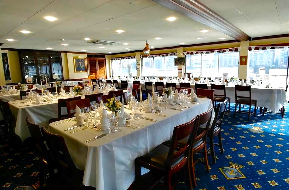 The boat occupies one of the most coveted positions in the heart of London, just downstream of Tower Bridge and The Tower of London, overlooking the entrance to St Katharine Docks. Permanently moored, HMS President has its own purpose-built jetty therefore offering a unique opportunity for your group to arrive by water.