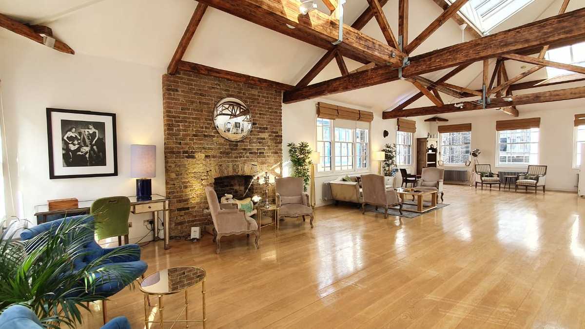 The Loft is on the third floor of Charlotte House with a private terrace and stunning views of the London skyline. Full of daylight, the loft consists of two open spaces with exposed brickwork, original wooden floors, and exposed beams, and a decorative fireplace. Modern amenities include the mezzanine area in one of the rooms, a designer kitchen with state-of-the-art equipment, two bathrooms, and a passenger lift for easy access.