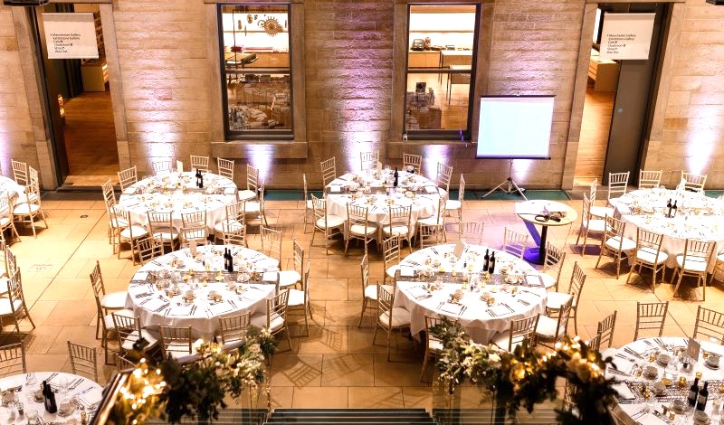 The Atrium connects the old and the new buildings of Manchester Art Gallery, creating a contemporary space filled with light. At night, the Atrium transforms to become a striking event space. It’s the perfect space for drinks receptions and dining. The Atrium is fully equipped with two large ceiling flown plasma screens and integrated PA system ideal for presentations and awards ceremonies or for ensuring those embarrassing childhood photos are seen by all during your wedding breakfast!