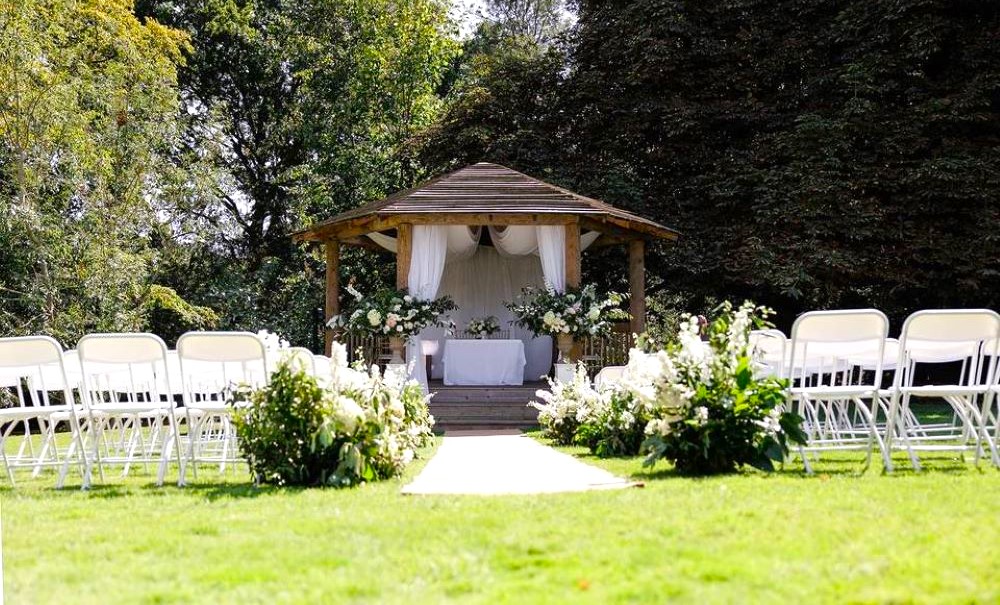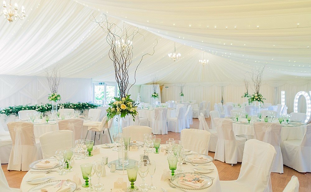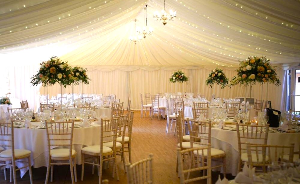 Hidden behind the beautiful Georgian house lies our stunning all season’s marquee. As well as being fully air conditioned, it has its own built-in bar and private decking area with lower outside terrace. The ivory draped, starlit ceiling with crystal chandeliers creates a magical feel for night-time occasions.