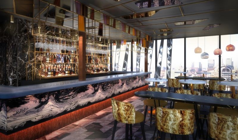 Set 12 storeys high at the top of DoubleTRee by Hilton in Tower Hill and far removed from the city’s concrete jungle below, the ethos is focused on the unexpected. Inside is brutal yet sultry, urban yet opulent with reflective, scored and savaged surfaces contrasting with plush velvet finishes and marbleised floors.