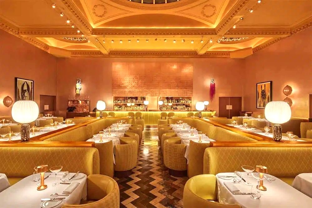 Designed in early 2018 by Mourad Mazouz and Andres Ros Soto, the Parlour has an eclectic yet luxurious feel, with playful fabrics and comfortable banquettes. The lighting evokes a neo-nineties atmosphere, with bespoke neon brightening the clear glass tables and gold walls.