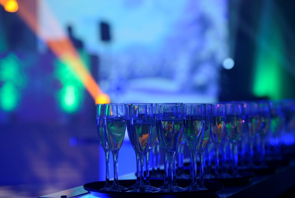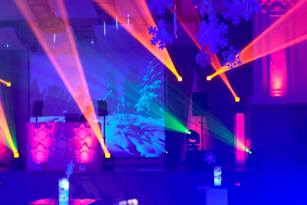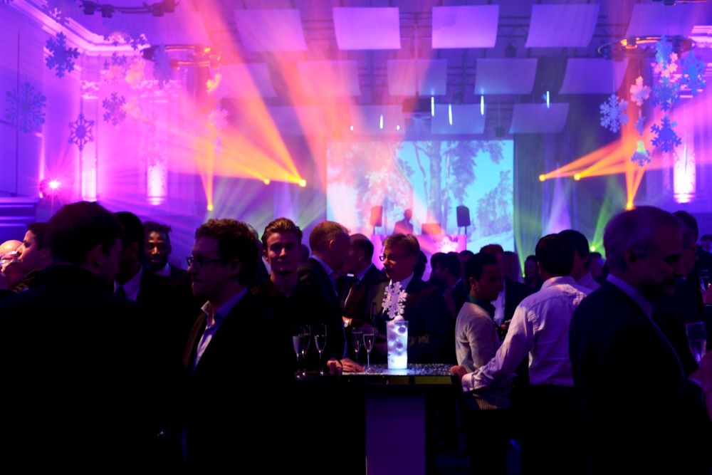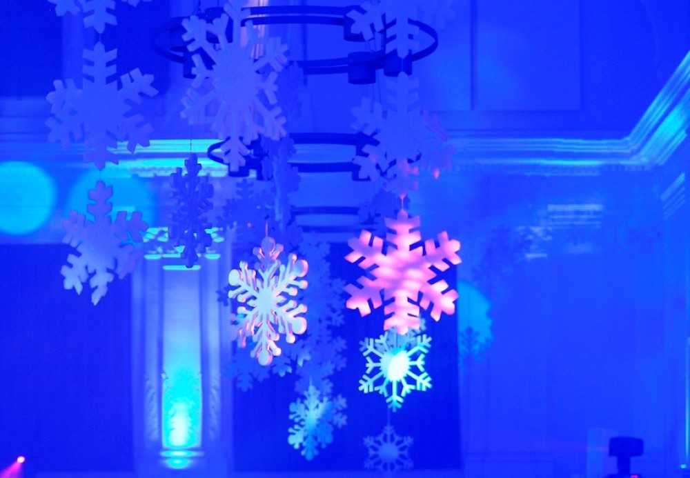 As they entered the Ballroom a flurry of snow fell upon them from above and they were hit by a dramatic Northern Lights display! Décor included gigantic snowflakes dangling from the ceiling changing colour with the lighting display throughout the evening. On the stage, DJ Dr Chill entertained the crowd in front of a huge screen of wintery scenes. Mirror topped poseur tables with LED-lit snowball centre-pieces and cool soft seating with frosty blue cushions and rugs added to the snowy atmosphere.