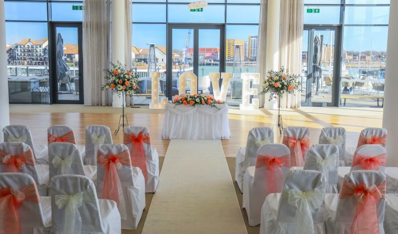 If you’re looking to make a statement, look no further than this stunning space. With floor-to-ceiling windows, sparkling chandeliers, a private bar and its own deck with epic views across the marina and out towards the Solent, it’s perfect for large conferences, celebrations and weddings.