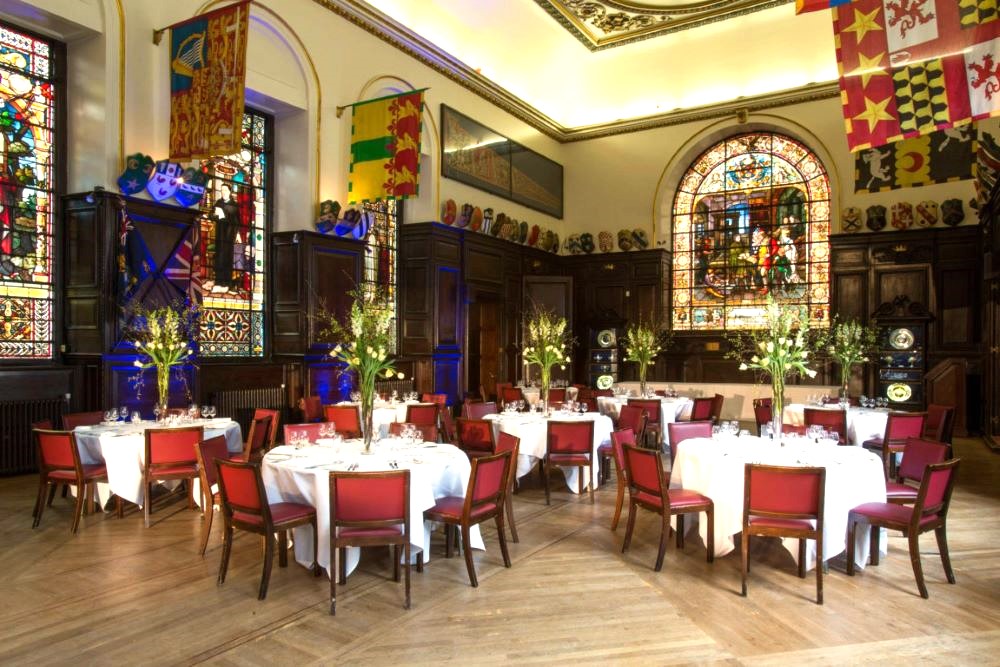 The Main Hall is the largest of the function rooms within Stationers’ Hall. Gleaming oak flooring and carved oak panelling originating from the 1600s, together with huge stained glass windows give this room an impressive ambience.