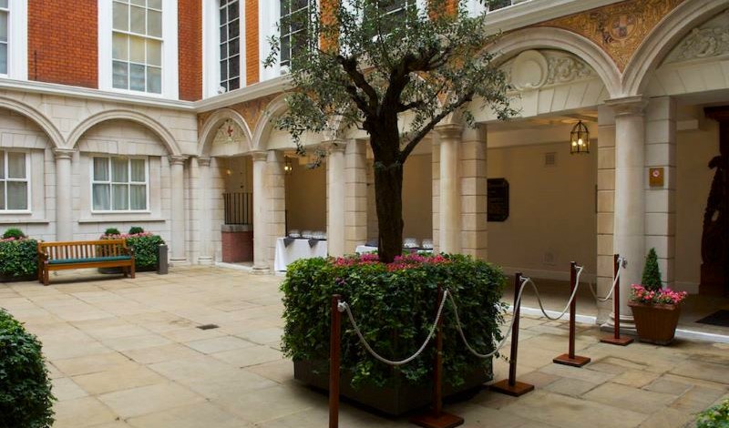 Guests enter through the ornate Company gates on Dowgate Hill in to a secluded Courtyard paved in York Stone enhanced with olive trees and flower displays. It provides a peaceful respite from the bustle of the City outside. Perfect for al fresco drinks and summer parties