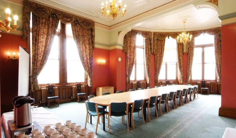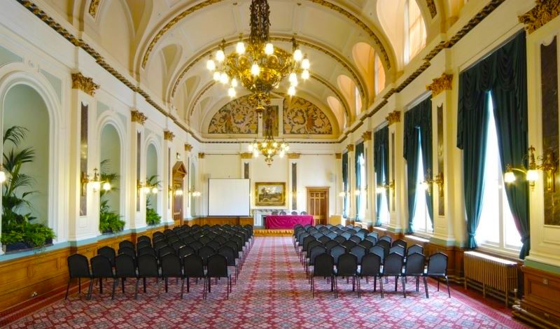 The Council Chamber is a semi-circular room with fixed tiered seating facing a central rostrum. The panelled Chamber displays Italian walnut carvings and painted screens depicting Truth and Justice. The Chamber is available for hire in conjunction with Banqueting Suite and Chamberlain Room events. With its modern microphone and audio-visual facilities, it is exceptionally well equipped for presentations, annual general meetings and conferences of all types.