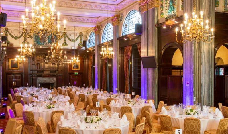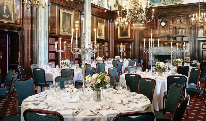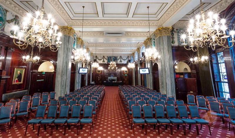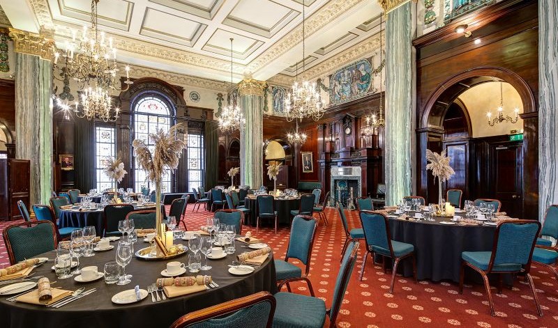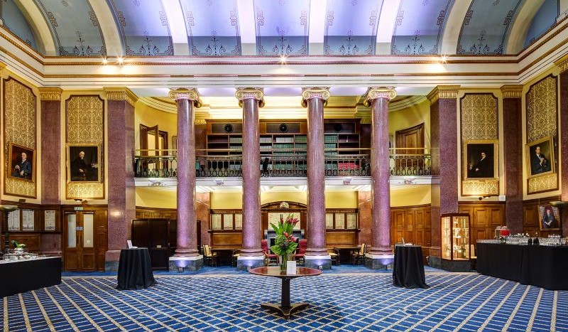 Our sweeping marble staircase leads you to the magnificent Common Room; this first floor room is the largest of our event areas and a space which truly reflects the gravity and prestige of this place. Graceful pillars of green marble draw the eye to Conrad Dressler’s celebrated Persian enamel frieze depicting human and divine justice, while mahogany panelling, 17th Century stained glass windows, and a peacock-tiled fireplace make this grand room wholly impressive for conferences and entertaining.