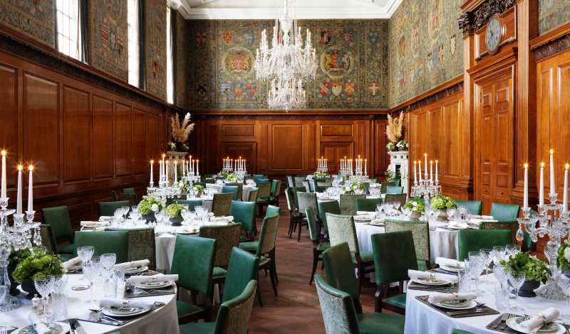 The Tapestry Room features original walnut panelling and crystal chandeliers, The Tapestry Room is the most iconic space. It takes its name from the remarkable pastoral tapestry that wraps around the upper walls – the largest of its kind ever produced in England when it was created in the 1920s.