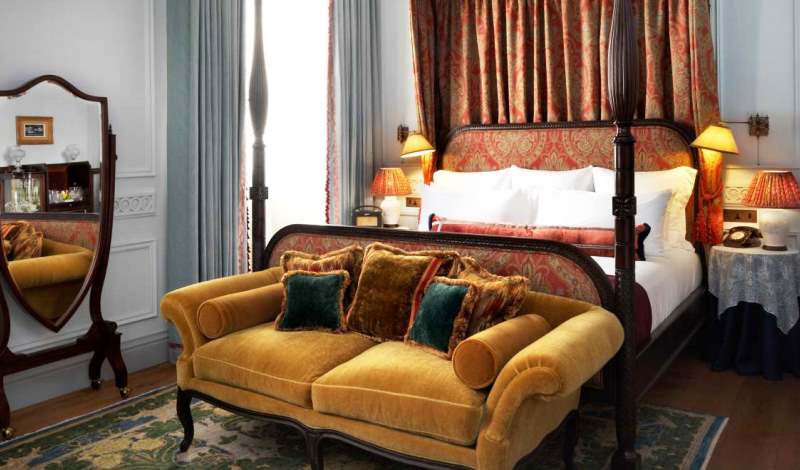 The Saloon is dominated by an 18th century chandelier from London’s Devonshire House and has ornate plasterwork, a restored parquet floor and a custom-made Oushak rug